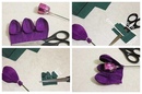 С самого начала нам нужно создать из гофрированной бумаги фиолетового цвета заготовки в виде квадратов. Размер квадрата – 4х6 сантиметров. Для одного соцветия колокольчика нам потребуется 4 лепестка, соцветий всего у нас будет 3.
