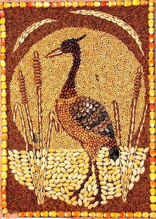 Для создания подобных работ может подойдёт любой подручный натуральный материал – кофейные зерна, бобовые, крупы, сухие листья, сухие веточки, кожа и т.