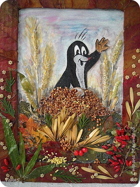 Через несколько минут можно стряхнуть с панно лишнюю крупу.