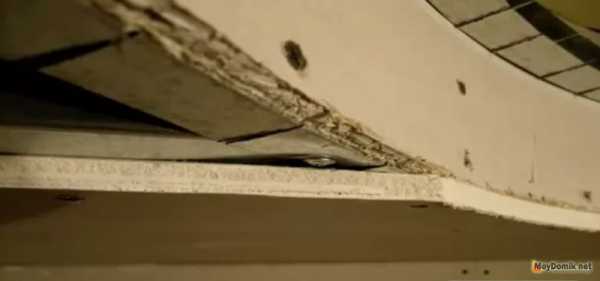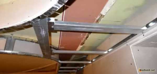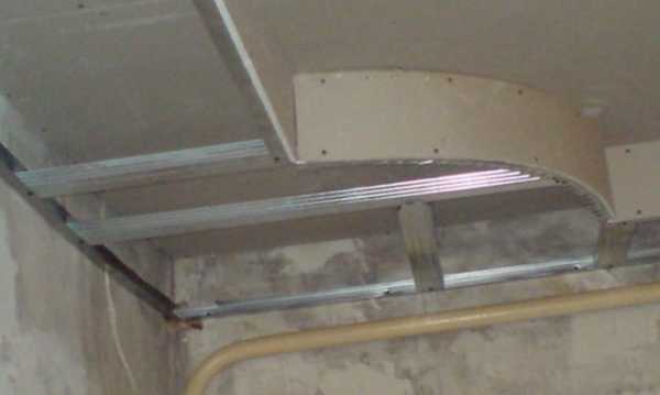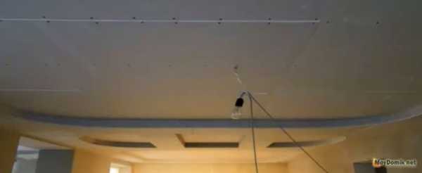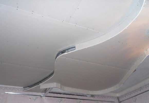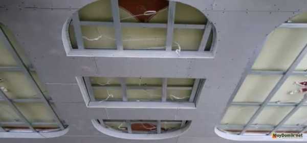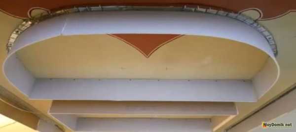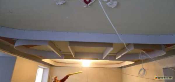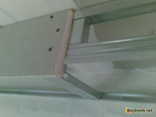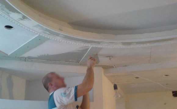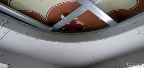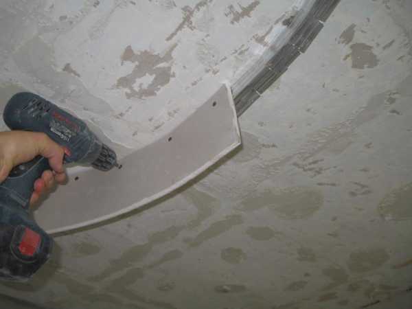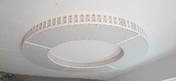 Затем под 90 градусов относительно потолочного перекрытия к профилю устанавливается гипсокартон. Делается это по периметру всего помещения за исключением полукруглых участков.
