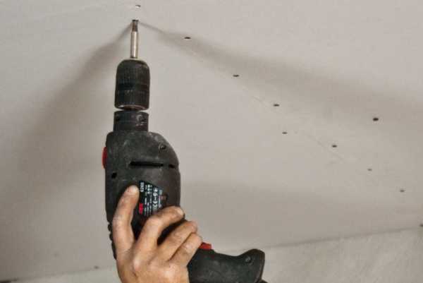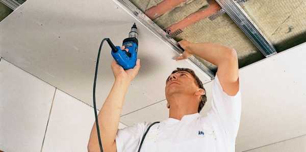 Поднимать лист гипсокартона и прикручивать его к каркасу лучше вдвоем. На один лист материала тратится примерно 60 саморезов. Их вкручивают на расстоянии 30-40 см друг от друга. При этом головка шурупа немного утапливается в лист гипсокартона. Это необходимо для дальнейшей процедуры шпаклевания и отделки потолка. При этом важно следить за тем, чтобы головка шурупа не прорвала бумагу.
