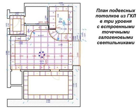 Варианты планировки двухуровневого потолка из гипсокартонаИзначально нужно подготовить чертеж с указанными размерами будущего объекта. Этот эскиз необязательно изготавливать по всем правилам черчения, важно лишь сделать замеры на месте монтажа и сопоставить все параметры.