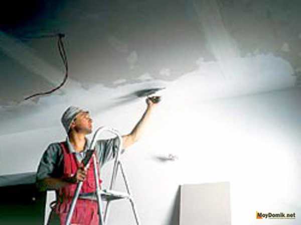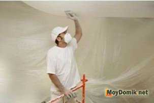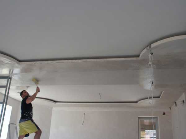Готовую конструкцию обрабатывают для последующей отделки. В зависимости от того, какие отделочные материалы будут использоваться, поверхность грунтуют, несколько раз шпатлюют и шлифуют наждачной бумагой. Чаще шлифовкой дело не ограничивается и поверхность двухуровневой конструкции готовят к окрашиванию, повторно грунтуя перед началом работ. Оптимальный вариант для отделки — краски на основе акрила.