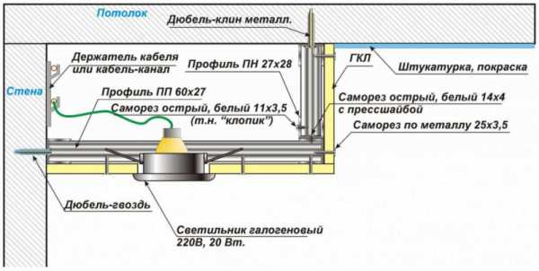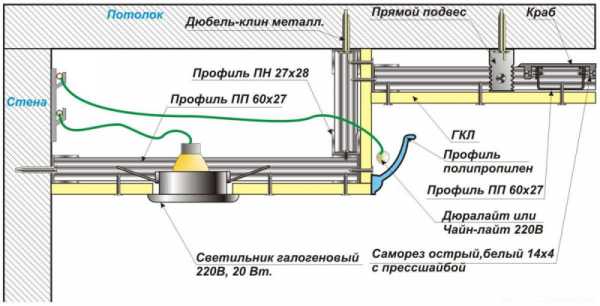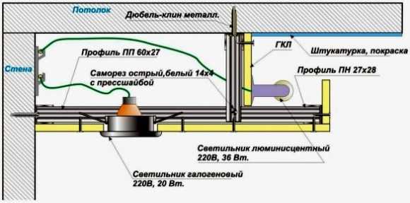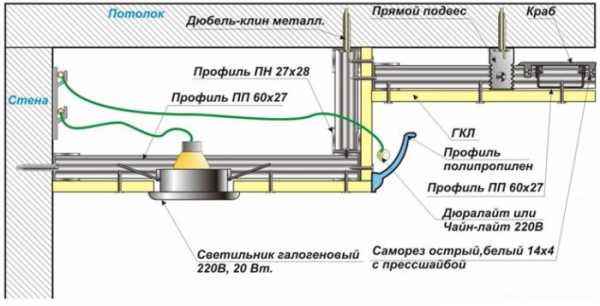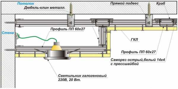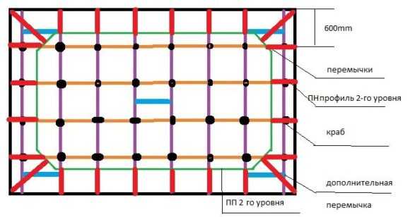 Схема устройства потолка из гипсокартона в два уровня