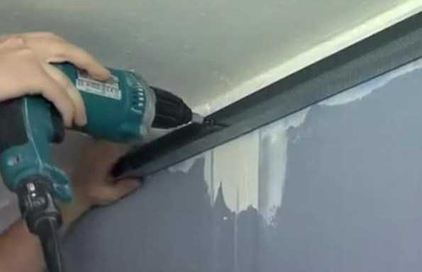На следующем этапе производят оклеивание направляющего профиля демпферной лентой. После оклеивания направляющего профиля демпферной лентой его горизонтально монтируют к поверхности каждой стены распорными анкерами. При этом нижняя полка направляющего профиля должна строго располагаться по прочерченной или проекционной линии нивелира.