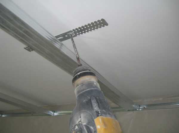 После временной раскладки несущего профиля, изгибают необходимое количество перфорированных подвесов в виде буквы «П». Далее каждый пока не закрепленный профиль равномерно сдвигают на 10 см в сторону, в потолочной плите перекрытия сверлят ряд отверстий диаметром 6-8 мм с шагом 80 см, после чего к потолочной плите начинают монтировать перфорированные подвесы. Смонтировав ряд подвесов, несущий профиль помещают между их свисающих лопастей, после чего профиль фиксируется поочередно к лопастям подвесов саморезами.