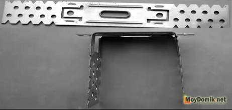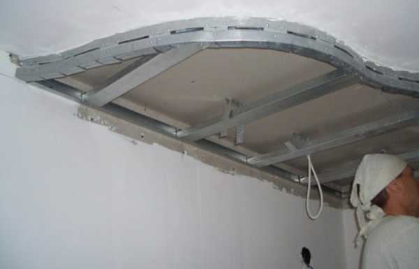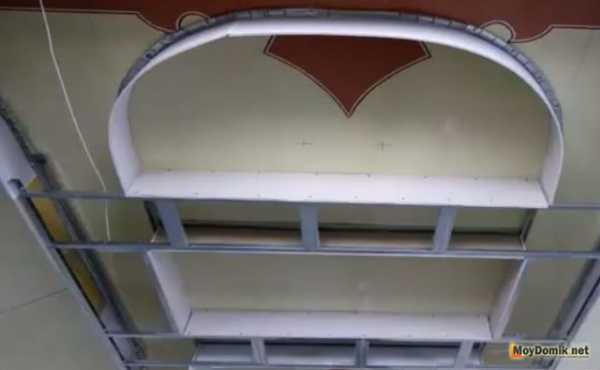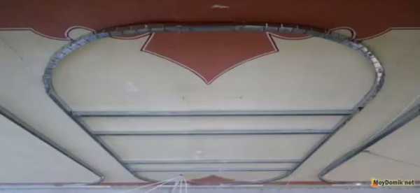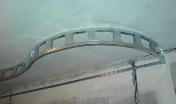 - По внешнему контуру крепят арочный профиль, или стандартный направляющий. Монтаж осуществляют так, чтобы полки были направлены в сторону стены. Вместо арочного профиля можно взять направляющий и сделав надрезы полок изогнуть в требуемую конфигурацию. Шаг креплений выдерживают в пределах 300-350 миллиметров.