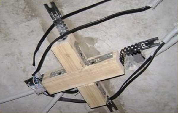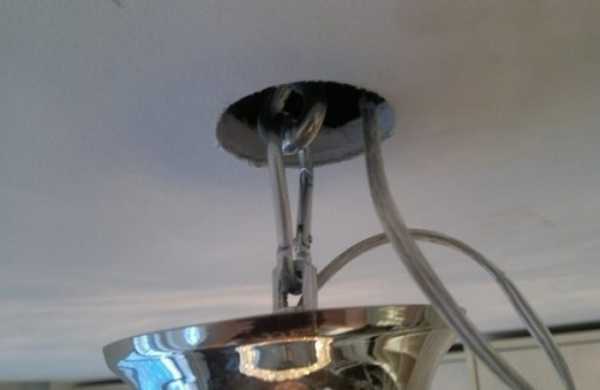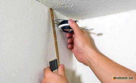 Если изначально по проекту, было задумано, в качестве освещения использовать подвесную люстру, то крепление для нее необходимо смонтировать еще до обшивки металлического каркаса гипсокартоном. Для этого к поверхности бетонной плиты перекрытия с помощью металлических подвесов закрепляют деревянную доску с размерами примерно 20х20 см, толщиной более 30 мм. Далее каркас обшивается ГКЛ, а после обшивке в гипсокартоне сверлят отверстие на 50 мм, сквозь которое в деревянную доску ввинчивают саморез на 200 мм. Через это же отверстия вытягивается кабель для подключения люстры. После этого двумя плоскогубцами торчащий саморез изгибается в виде крючка, на который в дальнейшем и будет повешена подключенная люстра, а сам крючок скрывается декоративной накладкой люстры.