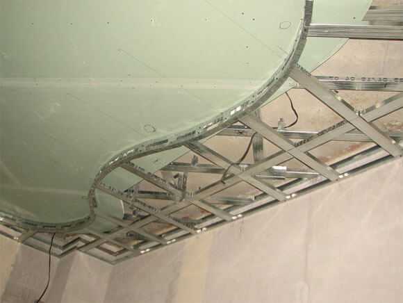 - Профили для гипсокартона используются такие же, как и при изготовлении каркаса первого уровня: направляющие UD и потолочные CD. Важно, при планировании неровных криволинейных форм на потолке приобрести арочный профиль, который можно изогнуть в требуемую конфигурацию.