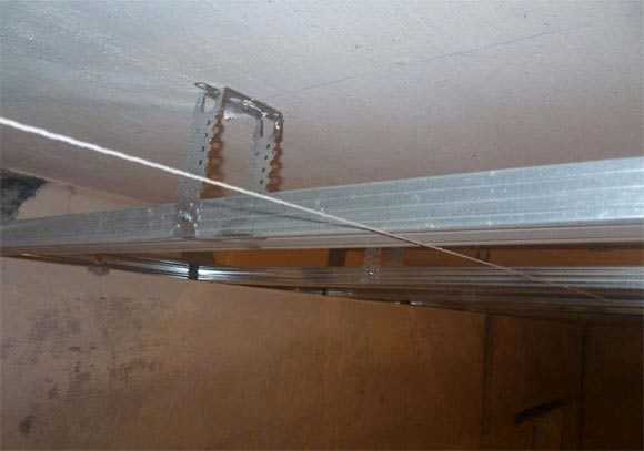Продолжают устройство потолка, используя капроновую нить для нивелирования профилей. В такие моменты получится определить, насколько правильное положение занимают элементы каркаса с возможной корректировкой (просто подгибают уши провисших потолочных профилей и регулируют их высоту). Только после этой простой, но важной процедуры профили прикручивают к подвесам и окончательно скрепляют между собой.