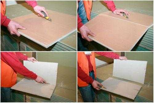 Для того чтобы обрезать гипсокартон ровно по прямой линии его укладывают на ровную поверхность стяжки и на нем размечают линию распила. Далее по линии укладывают на лист ГКЛ алюминиевое правило и по кромке правила проходят с небольшим нажимом канцелярским ножом так, чтобы картон был полностью прорезан, а гипсовая структура неглубоко процарапана. После этого под пропиленный лист на ребро укладывают деревянный брусок и, выполняя резкий нажим, гипсокартон ломают ровно по линии. Если необходимо обрезать гипсокартон по кривой радиусной линии, то резку производят маленькой УШМ с диском по камню.