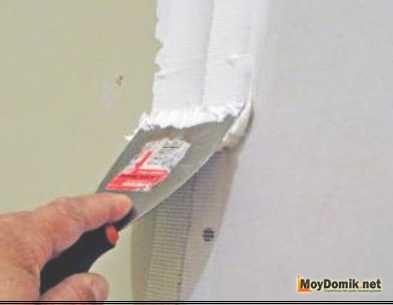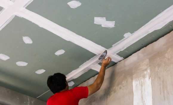 Стыки между отдельными листами первоначально проклеивают лентой серпянкой и шпаклюют универсальной гипсовой смесью. При этом кладут тонкий слой, чтобы лишь немного выровнять поверхность.