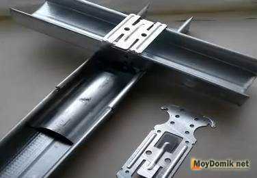 После монтажа направляющего профиля, необходимо точно замерить расстояние между его внутренними основаниями. Зная точную длину, необходимо заготовить нужное количество несущих потолочных профилей. Потолочный несущий профиль купить реально с максимальной длиной 400 см, более длинный профиль необходимо заказывать, что не всегда выгодно. Поэтому дешевле и проще срастить между собой два несущих профиля. При сращивании один несущий профиль вводят на 80-100 см в другой профиль, после чего выполняют их фиксацию саморезами по металлу. Общее количество несущих профилей нужной длины рассчитывают таким образом, чтобы шаг между параллельными металлопрофилями составлял 1200 мм, если замер производить на середине оснований двух соседних параллельных профилей.