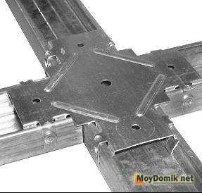 На следующем этапе заготавливают рассчитанное количество перемычек длиной 114 см. Перемычки располагают поперечно между параллельными несущими профилями с интервалом в 50 см и производят их фиксацию металлическими соединителями типа «краб». Краб располагают сверху над каждой точкой соединения, после чего все элементы фиксируются саморезами за счет отверстий предусмотренных в лопастях краба.