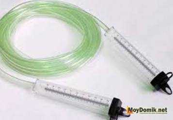 Гидроуровень своими руками формируется по следующей схеме: одну его часть нужно опустить в ванну либо ведро с водой. После этого – поднять выше уровня другой его части, и через противоположный край всосать воздух. Вода зайдёт в шланг и равномерно распределиться по ней, не образуя пузырьков.