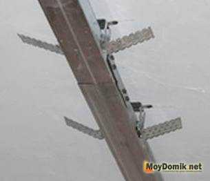 - Если длина горизонтальных стоек будет более чем 500 мм, нужно использовать прямые подвесы. Их фиксируют к перекрытию дюбелями-гвоздями, а подогнутые «крылья» к стойкам каркаса.