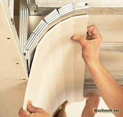 Если нужно согнуть гипсокартонную деталь, то по ее тыльной стороне делают перфорацию (например, шилом) и смачивают водой. Мокрую заготовку укладывают на каркас, и постепенно изгибая, осторожно ввинчивают в нее саморезы. Когда она высохнет, то сохранит нужный по форме контур. Готовую гипсокартонную обшивку можно тут же готовить под отделку.