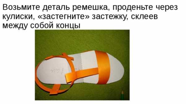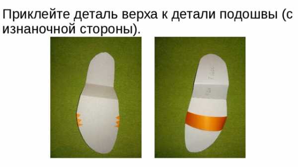 — Обратите внимание на тапочек. Две полоски приклеиваются параллельно друг другу, а третья линия – перпендикулярно двум полоскам. Лишнюю часть полоски можно отрезать. Полоски приклеиваются к подошве тапочка снизу
