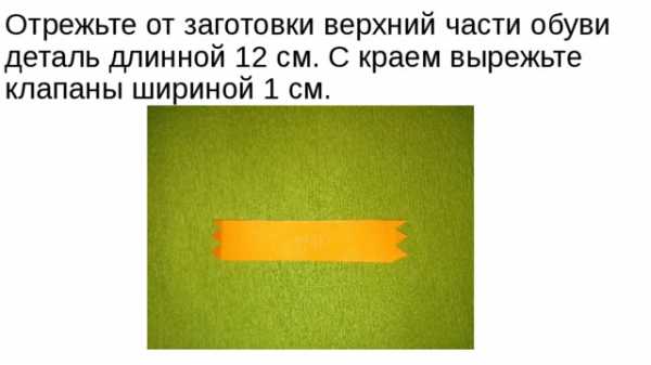 Отрежьте от заготовки верхний части обуви деталь длинной 12 см. С краем вырежьте клапаны шириной 1 см.