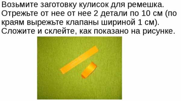 Возьмите заготовку кулисок для ремешка. Отрежьте от нее от нее 2 детали по 10 см (по краям вырежьте клапаны шириной 1 см). Сложите и склейте, как показано на рисунке.