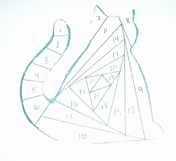 Количество и расположение полосок на нём должно будет соответствовать количеству и расположению полосок на законченной работе. Каждая полоска на шаблоне отмечается цифрой с целью определения последовательности наклеивания этих самых полосок. Очевидно, полоска №1 наклеивается первой.