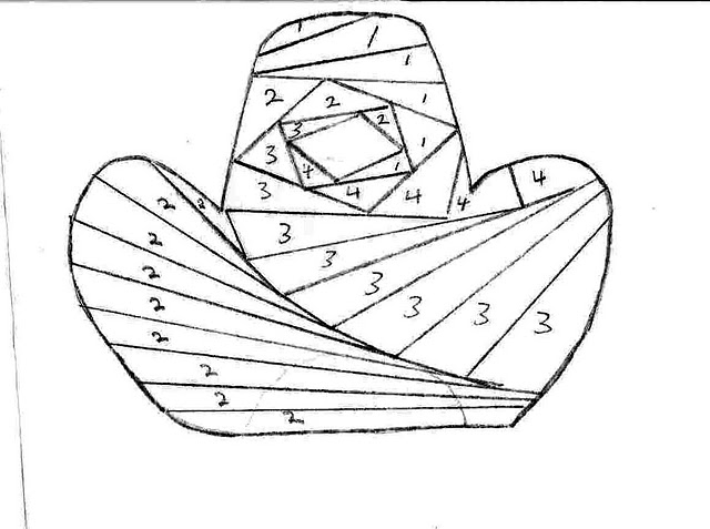 Нарежьте ткань на полоски шириной примерно 2 дюйма для облегчения складывания. Затем, начиная с номера один, сложите выбранную полоску ткани пополам по длине и поместите ее прямо над частью рисунка номер один так, чтобы складка была направлена внутрь.