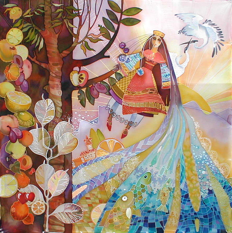 Часто задается вопрос по искусственным тканям. Искусственный шелк в батике редко используется: на нем часто расплывается резерв, он хуже впитывает краску. Из плюсов — на подрамнике искусственный шелк растягивается меньше, чем натуральный