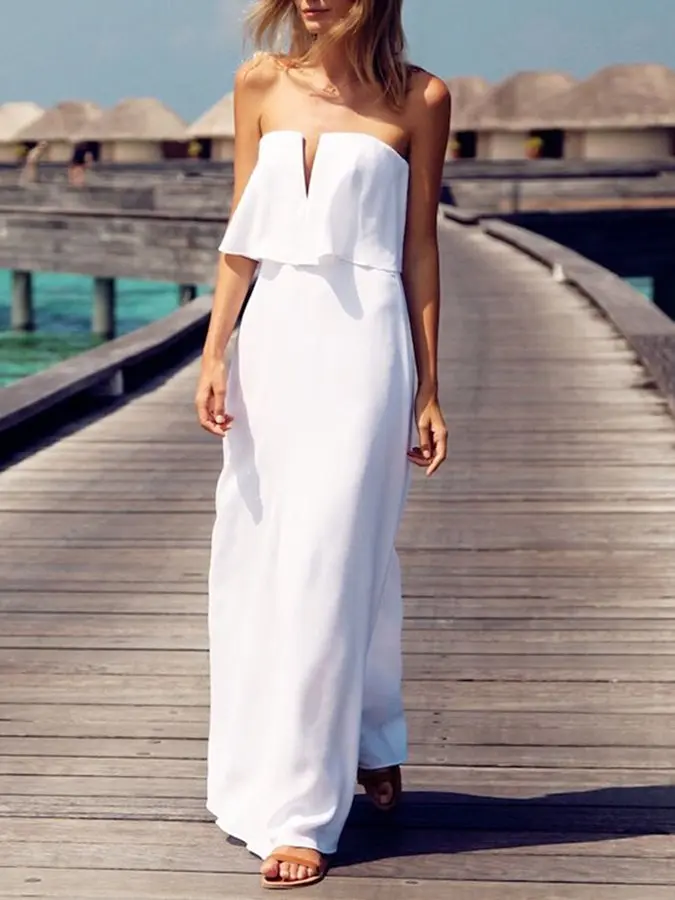 Белое летнее платье макси — прекрасный выбор для пляжа и песка. Это без рукавов с завязками на шее. Возможно, самая великолепная часть — это тонкая спинка с ремешками. Это делает низкий вырез на спине, который может показать ваш загар. Юбка представляет собой ряд с рюшами, который (скажем прямо) идет ко всем типам фигур. И если этого недостаточно, он доступен еще в девяти цветах.