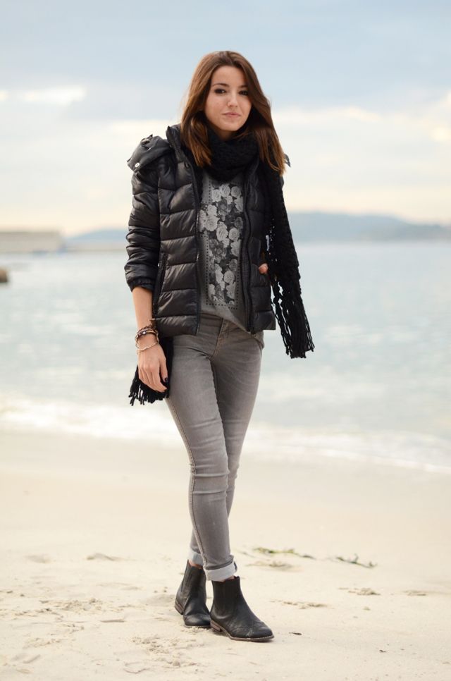 - Пуховик. Хорошим выбором к нему будут широкие и узкие брюки, джинсы, леггинсы, ботильоны и кроссовки.