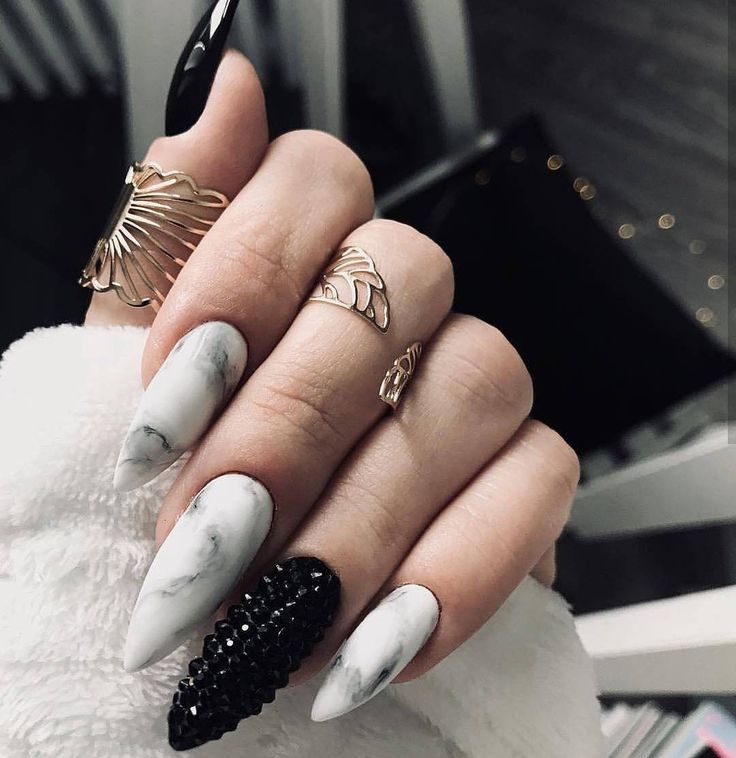 Источник: sloteazzy – instagram.com черные и белые ногти. Ногти чередуются между сплошными черными ногтями и натуральными ногтями с белыми кончиками; у белых ногтей есть великолепная линия жемчуга посередине, а у черных ногтей есть всплеск цвета в драгоценных камнях, которые на них.