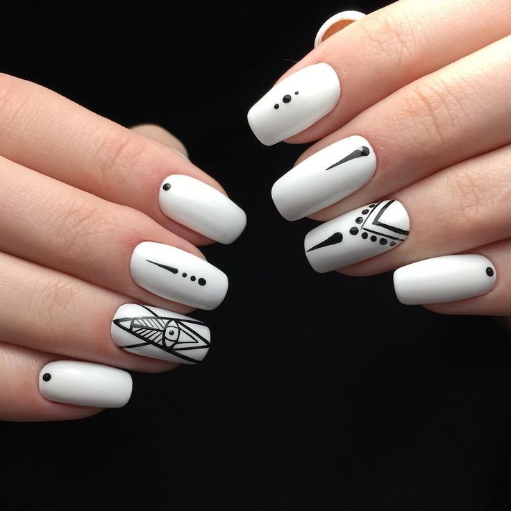 Эти белые ногти очень красивы в своей простоте. На них есть эти великолепные индейские шрифты черного цвета, которые действительно привлекают внимание. Дизайны просты в исполнении, но смотрятся очень красиво, а практичная длина и форма ногтей позволяют носить их даже во время работы или домашних дел.![]()