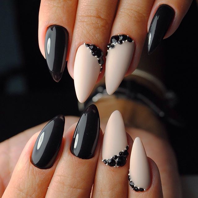 Эти ногти представляют собой чередующиеся черные и белые ногти; однако на них есть эти великолепные драгоценные камни, жемчуг и искусственные бриллианты, из-за которых они выглядят так, будто кто-то украсил их пиратским сундуком с сокровищами. Они сверкают и сияют, как бриллианты, и выглядят просто потрясающе. Если вы ищете наилучшее сочетание роскоши и изящества, это может быть идеальным стилем для вас.