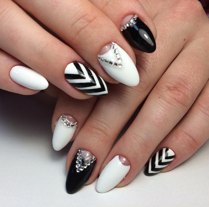 Эти ногти очень легко красить, и, несмотря на простоту дизайна, они не менее стильны при всем при этом. Один ноготь белый, следующий черный, следующий белый и так далее и тому подобное. Ногти блестящие и миндалевидные, и они подходят к любому типу одежды, с которой вы их сочетаете.