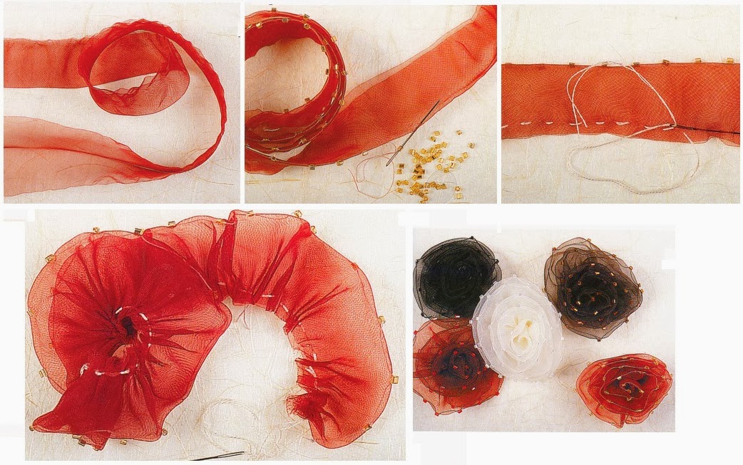 Цветы можно выполнить в домашних условиях и, порой, без особых приспособлений.ткань для их изготовлений и отделки можно найти у себя в гардеробе.для этой цели подойдет как старя блузка, таки ленточки от упаковок.