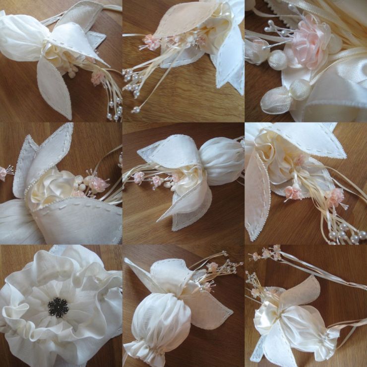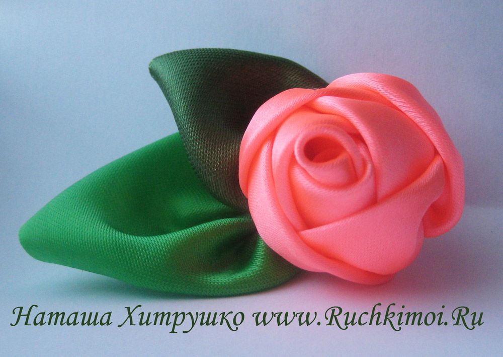 Некоторые мастера, нагревая край атласной ленты, сгибают складками ткань и простым придавливанием пальцами скрепляют заготовку, как клеем.