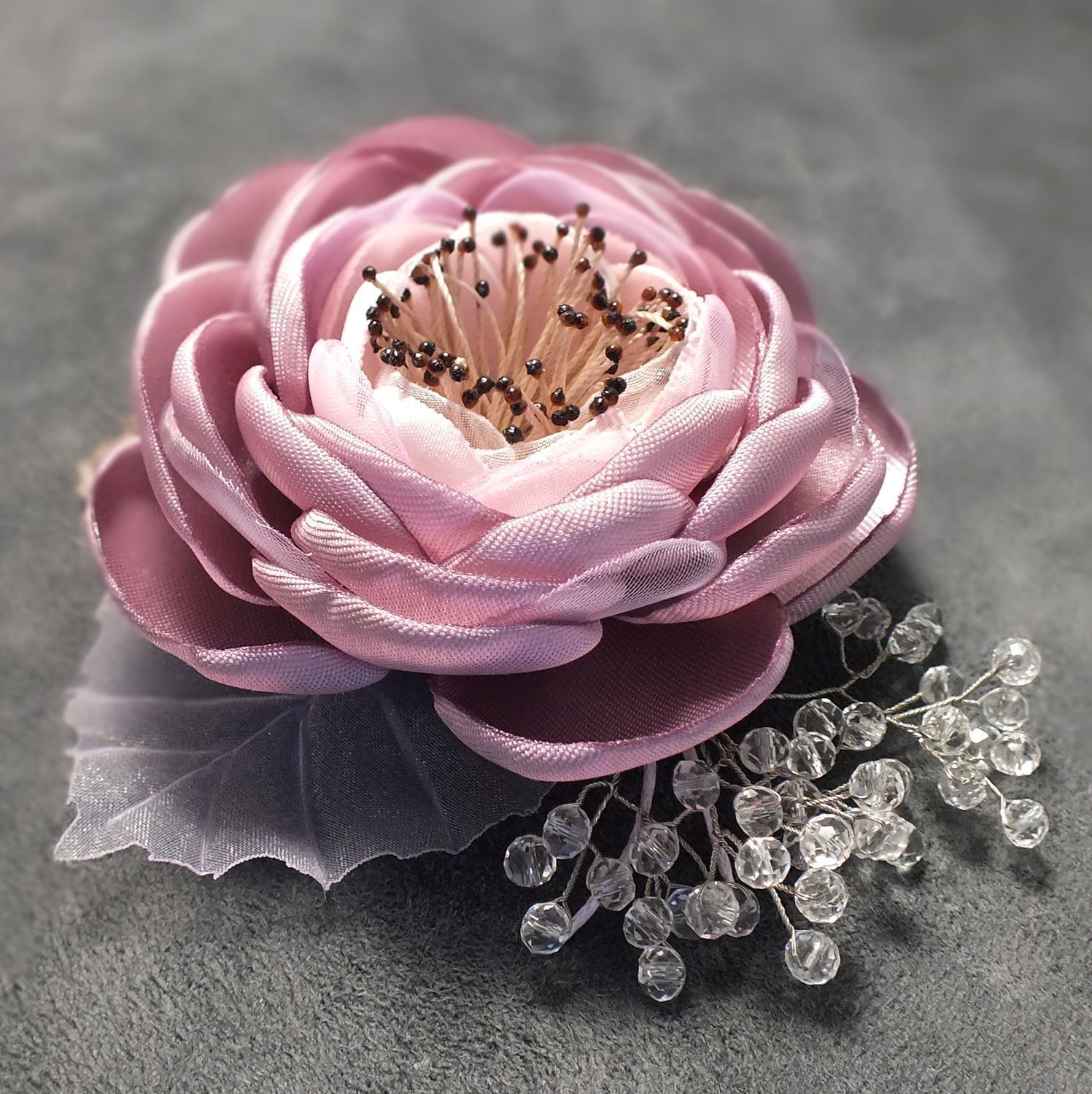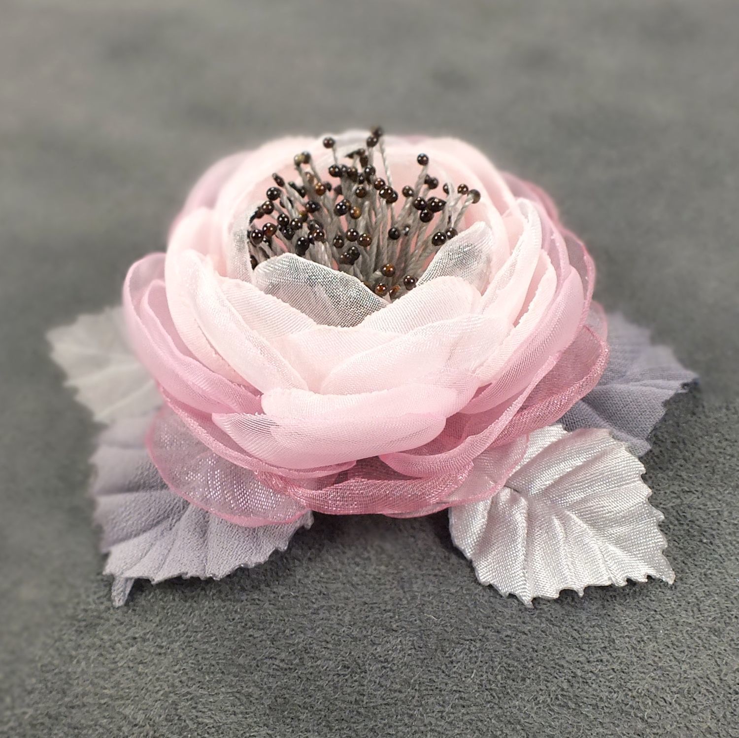 Красивый цветок можно собрать на резинку или заколку, используя небольшой отрезок тонкой ткани. Для работы также понадобятся булавки с бусинкой на конце, тонкая нить для соединения частей поделки, декоративный элемент для оформления серединки цветка.