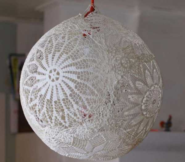 Шаг 5. Когда клей высохнет, проколите шарики и аккуратно извлеките его через кружевное отверстие. Затем проденьте в шарик веревочку и повесьте в помещении.