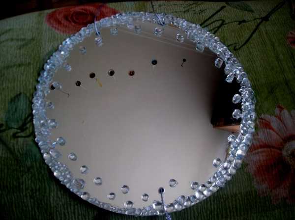 Вам понадобятся разноцветные или однотонные бусины. Можно приобрести модели разные по диаметру и оттенкам. Наносите на края зеркала клей и приклеивайте бусины (или же стразы).