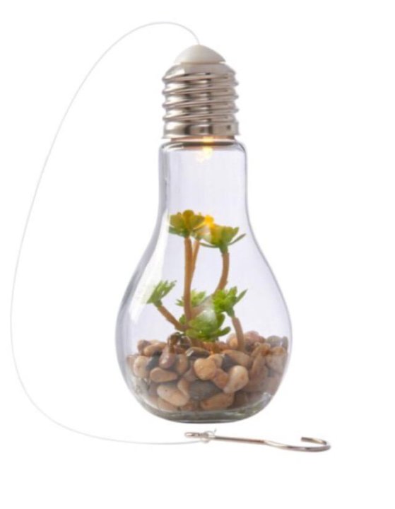 Миниатюрный, нет — миниатюрненький садик из лампочки, горстки камешков и крохотного растения будет отлично украшать любой интерьер. Воду придётся подливать регулярно. И не вешайте эти украшения там, где вы ходите — снесёте головой, будет очень жаль.