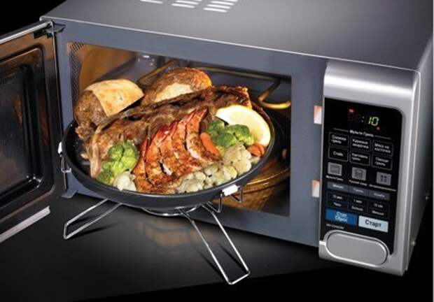 Приготовление пищи в микроволновке с использованием гриля, происходит при очень высокой температуре.