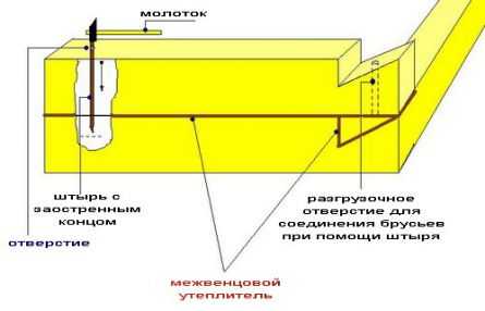 - Для профилированного и клееного бруса достаточно применять по 4-5 деревянных шкантов на 6-метровое бревно, они и так будут скреплены между собой замком «шип-паз».