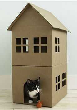 Принцип создания таких домиков для кошки схож с принципом изготовления домика для кошек с когтеточками и «этажами». Небольшой совет: используйте толстый картон.