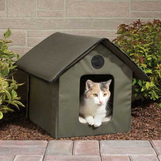 В магазинах можно найти домики для котов, визуально похожие на собачьи будки, обтянутые водоотталкивающей тканью, такие изделия можно ставить не только в доме, но и на территории сада.