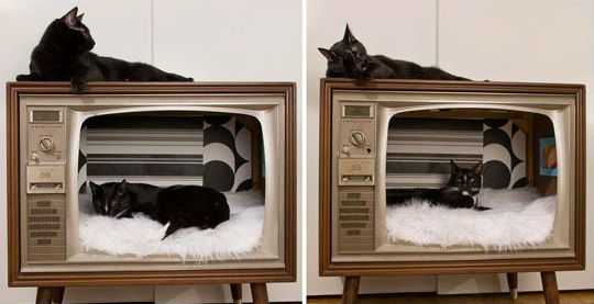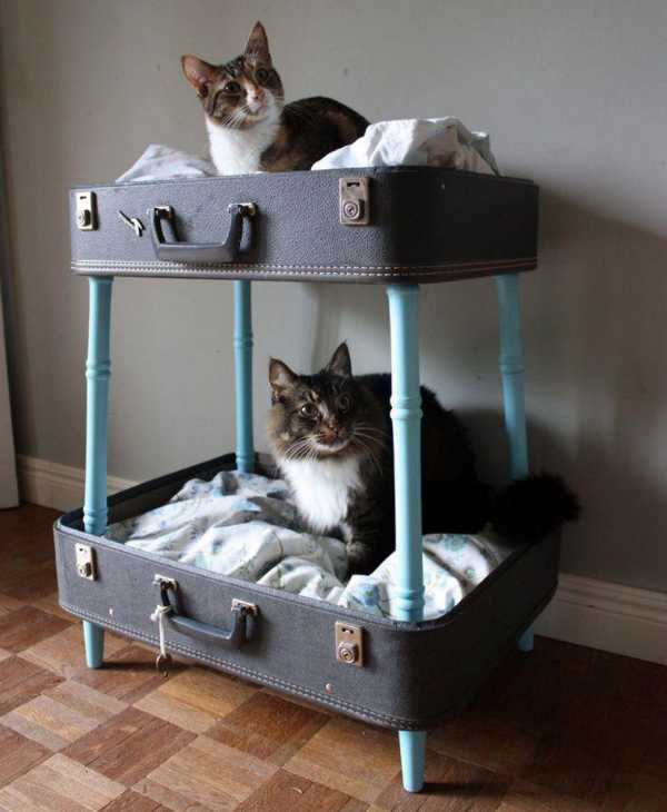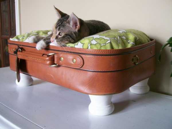 На заметку: домик-лежак можно смастерить из старого чемодана, к нему снизу нужно привинтить ножки и уложить мягкий коврик внутрь. Поверьте, кошка будет счастлива получить такой шикарный подарок.