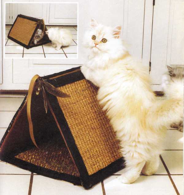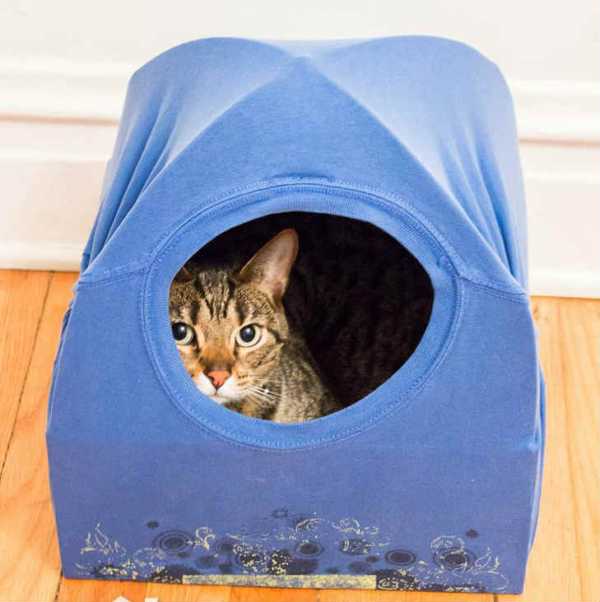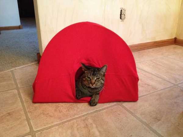 Этот домик для кошки своими руками не только прост в создании, но и достаточно удобен. Ведь если питомец его повредит, вещь можно легко заменить. Очень удобна такая кошачья палатка, если у вас во дворе нет тенька, а кошечка любит наслаждаться свежим воздухом.