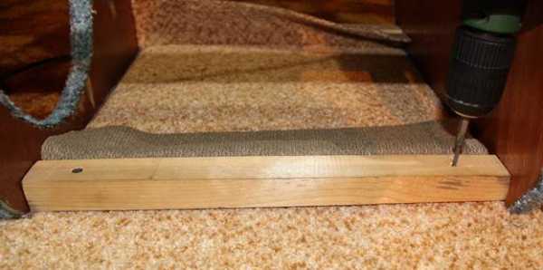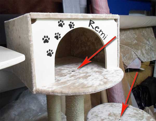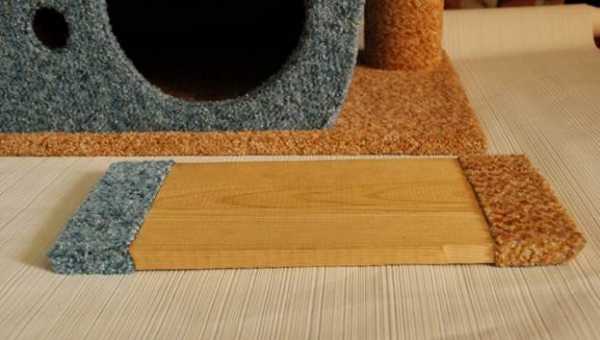Последний этап изготовления таких домиков для кошки – создание верхней площадки. Это просто – достаточно взять кусок фанеры, присоединить его шурупами к столбам и наклеить сверху ковролин.