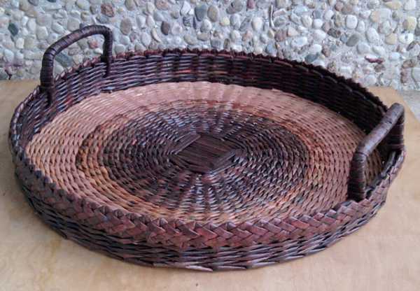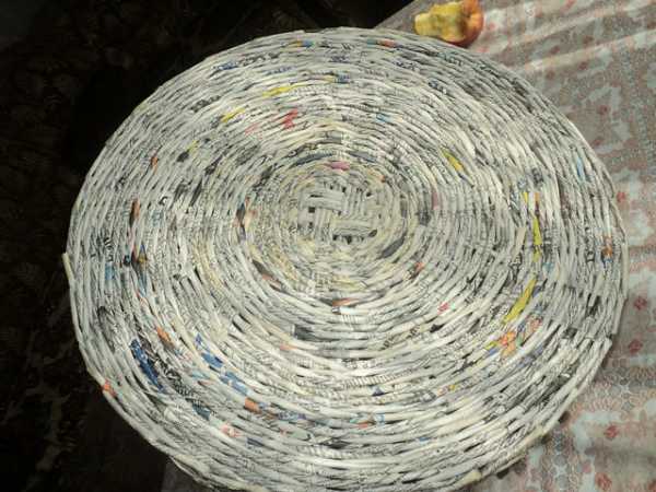 Из картонки вырезаем маленький круг – это будет дно. К нему приклеиваем 10 длинных трубок так, чтобы они соединялись в центральной точке и были равномерно распределены, как лучи. Берем трубку и, начиная от центра, проплетаем ее по кругу. Когда она закончится, приклеиваем к ней другую и продолжаем плетение.