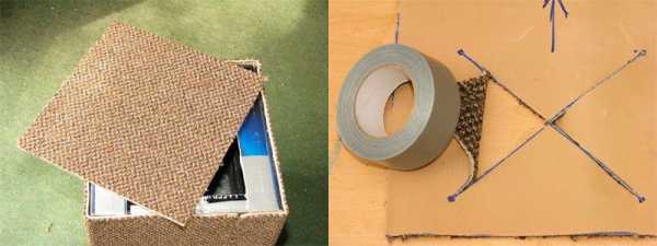После этого пора обработать куски тканью. Кусочки должны на пару сантиметров превышать размер досок. Их приклеивают с помощью клеевого пистолета. Передний кусок приклеивают целиком, а затем прорезают дырки.