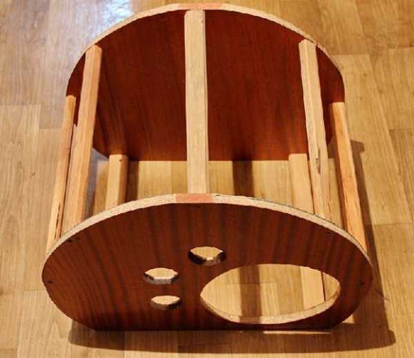 Далее, нужно сделать две боковые детали, которые нужно сначала приклеить, а потом присоединить шурупами к основе, потом присоединить к ним верхушку. Далее, замеряем площадь для задней и передней стенки, вырезаем их из фанеры, не забывая сделать низкую круглую или прямоугольную дырку в передней стенке, и присоединяем их.