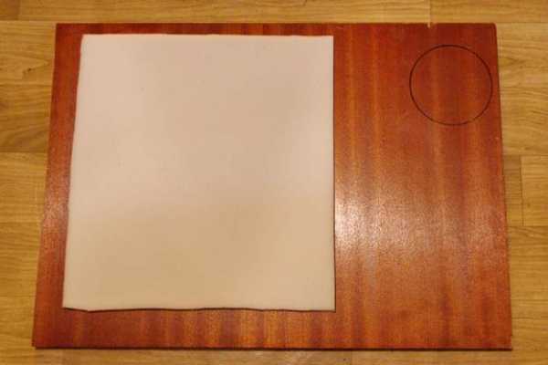 Будущий домик будет располагаться на специальной платформе. На подходящий кусок древесины (примерно 40х120) наклеивается лист поролона (40х70). Сбоку от него должно быть достаточно места для трубы, из которой будет сделана когтеточка. Место отмечают окружностью.